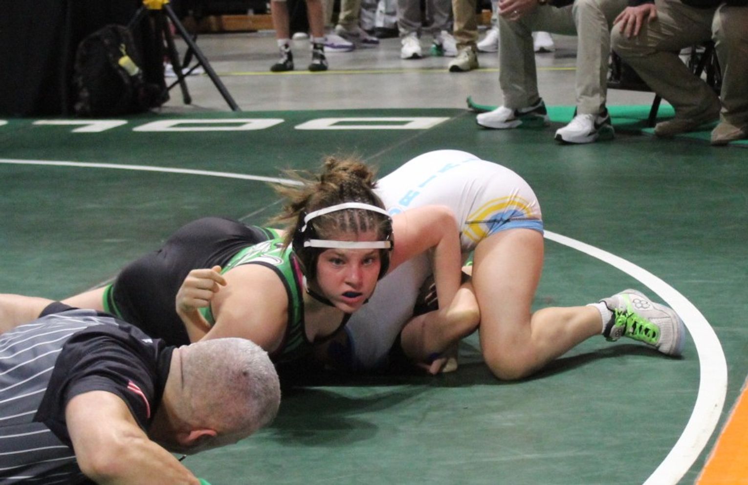 Senior Chase Yancey set the tone early, opening the finals with a decisive championship win. Elizabeth Yelle followed with one of the most dramatic bouts of the night, rallying in the third period and winning in a tiebreaker to secure her state title. In his excitement over Yelle’s win, coach Jayson Conger jumped into the arms of assistant coach Tristan Bradshaw.