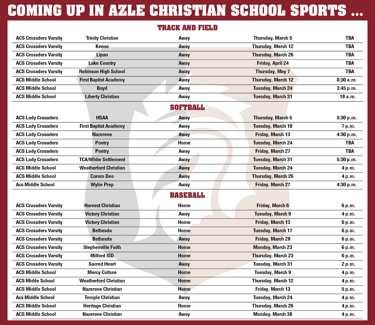 Azle Christian School Sports Calendar
